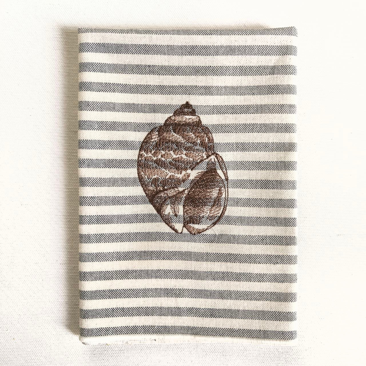 Servilleta de algodón con rayas azules sobre fondo crudo, con un estilo muy marinero. El bordado es de concha marina realizado con hilo de color marrón