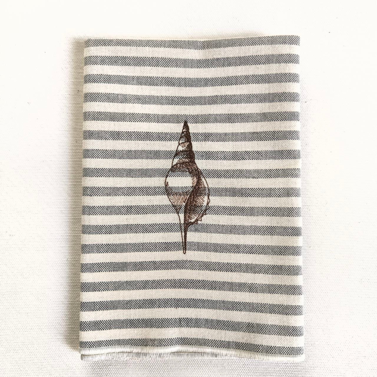 Bordado de concha en color azul o en color marrón, con borde remallado blanco roto.